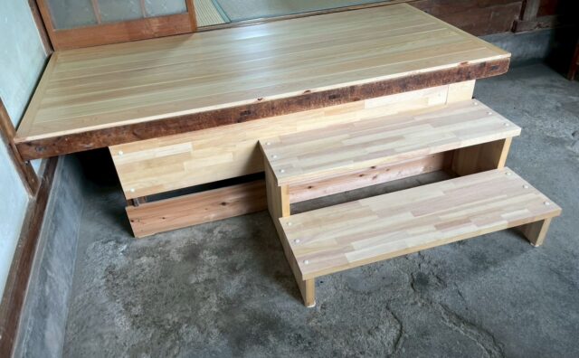 お客様のご要望:年齢とともに50㎝の段差がしんどくなってしまったので階段と手すりを取り付けてほしい!縁台にも思入れがあるので使用...